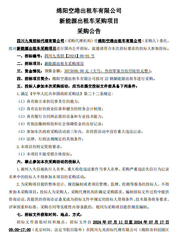 綿陽空港出租車有限公司新能源出租車采購項目采購公告