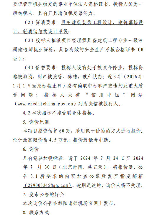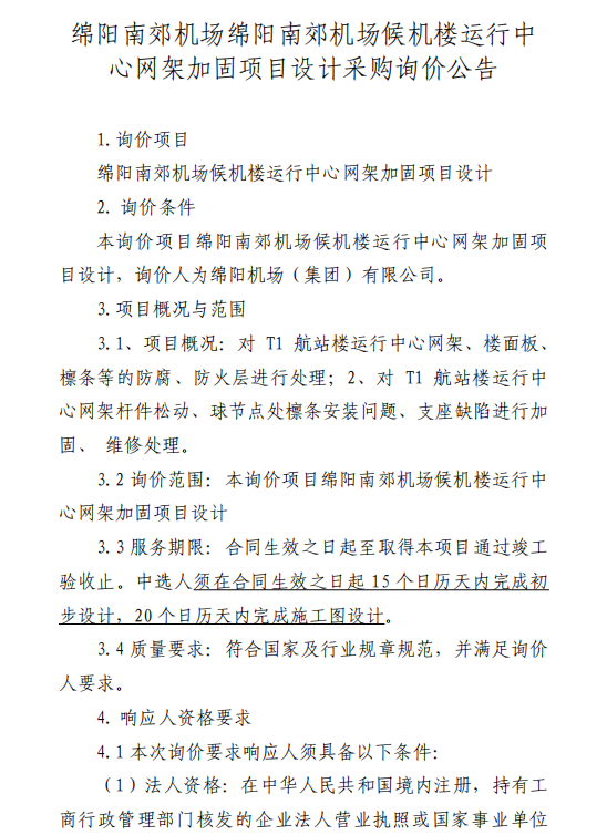 綿陽(yáng)南郊機(jī)場(chǎng)綿陽(yáng)南郊機(jī)場(chǎng)候機(jī)樓運(yùn)行中心網(wǎng)架加固項(xiàng)目設(shè)計(jì)采購(gòu)詢價(jià)公告