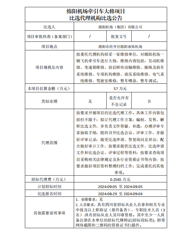 綿陽機(jī)場(chǎng)牽引車大修項(xiàng)目比選代理機(jī)構(gòu)比選公告