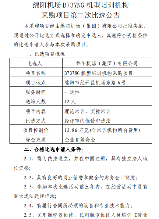 綿陽機場B737NG機型培訓機構(gòu)采購項目第二次比選公告